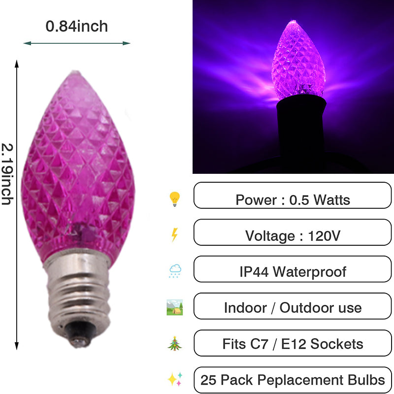 25 Pack C7 Led Replacement Bulbs, Commercial Grade 3 SMD LEDs in Each C7 Faceted Lights Bulb for Outdoor String Lights Decoration (purple)