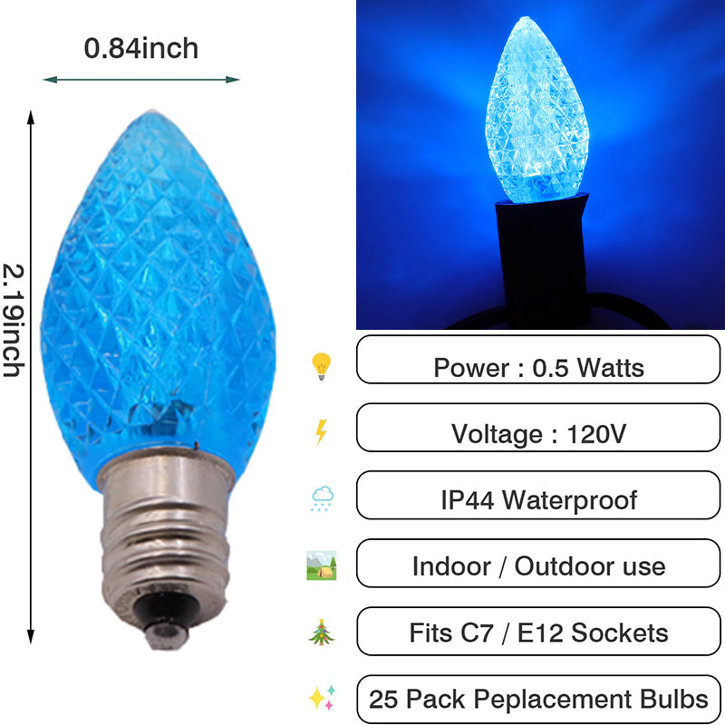 25 Pack C7 Led Replacement Bulbs, Commercial Grade 3 SMD LEDs in Each C7 Faceted Lights Bulb for Outdoor String Lights Decoration (Water blue)
