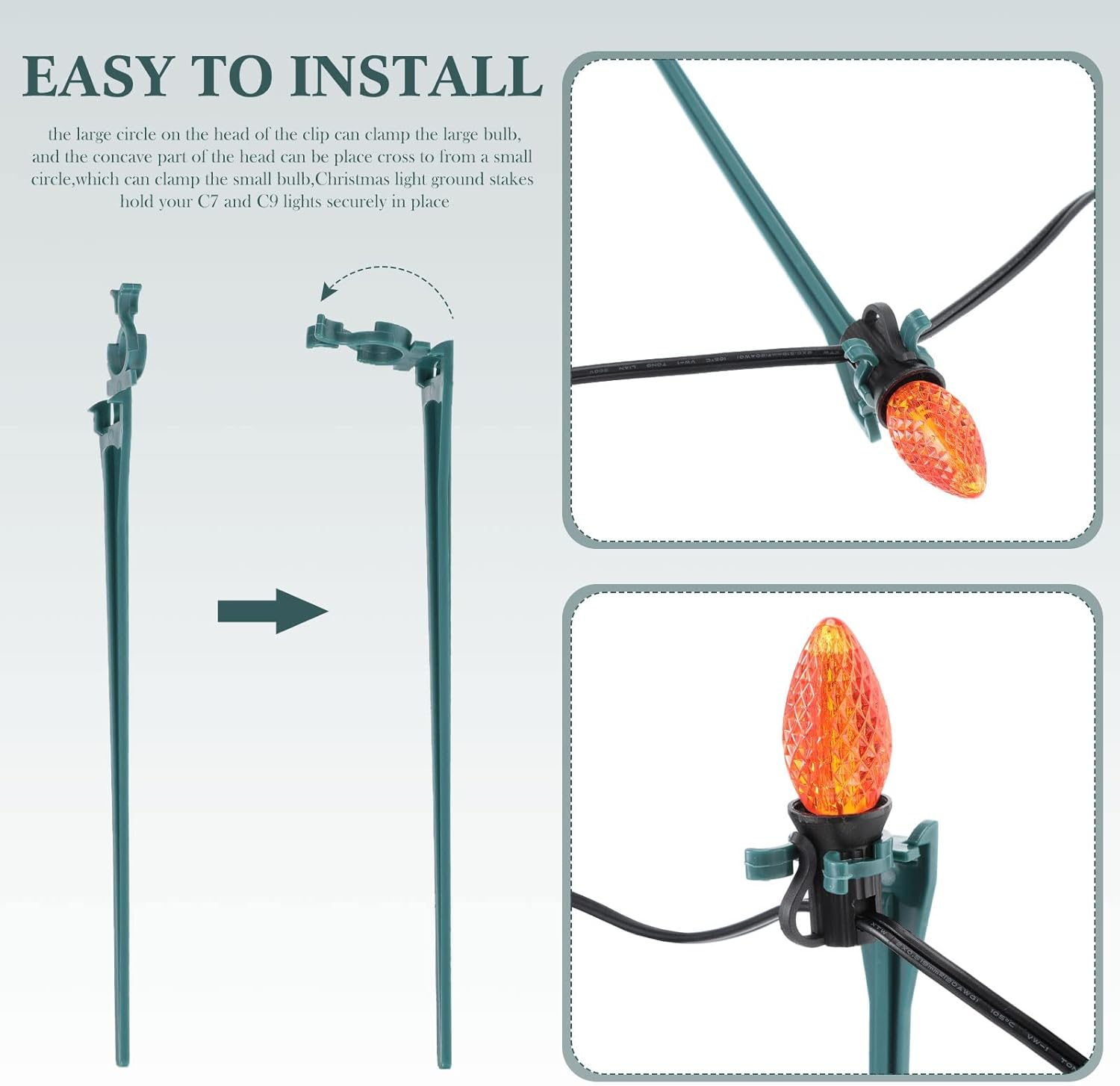 - FOR A VARIETY OF HOLIDAY LIGHTS: 50 Pack light clips for outside string lights, extend the beauty of your house with Christmas lights using our outdoor light hooks. Universal Christmas light clips and outdoor light clips for COMMERCIAL and RESIDENCIAL projects. These hooks for outdoor string lights are hanging clips designed to hold a socket light line with C9 and C7 LED Bulbs and icicle lights